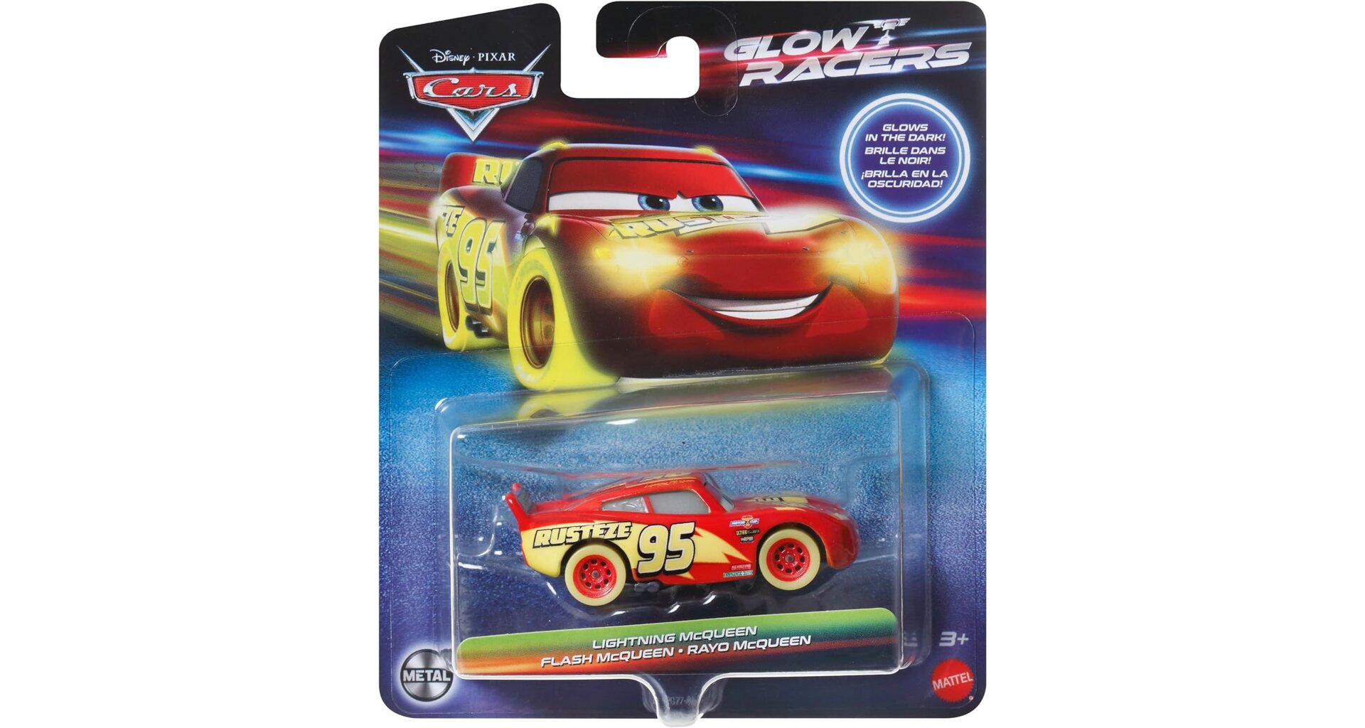 V tomto balení na vás čeká čtyřkolí hrdina Blesk McQueen ve skvělém a zbrusu novém provedení. Hlavním tahákem téhle řady je nová vychytávka, díky níž části aut svítí ve tmě! Kola, blatníky, světlomety, nápisy,... Blesk, Burák a Cruz Ramirezová tak nyní mohou soutěžit i pod rouškou tmy a budou skvěle vidět.