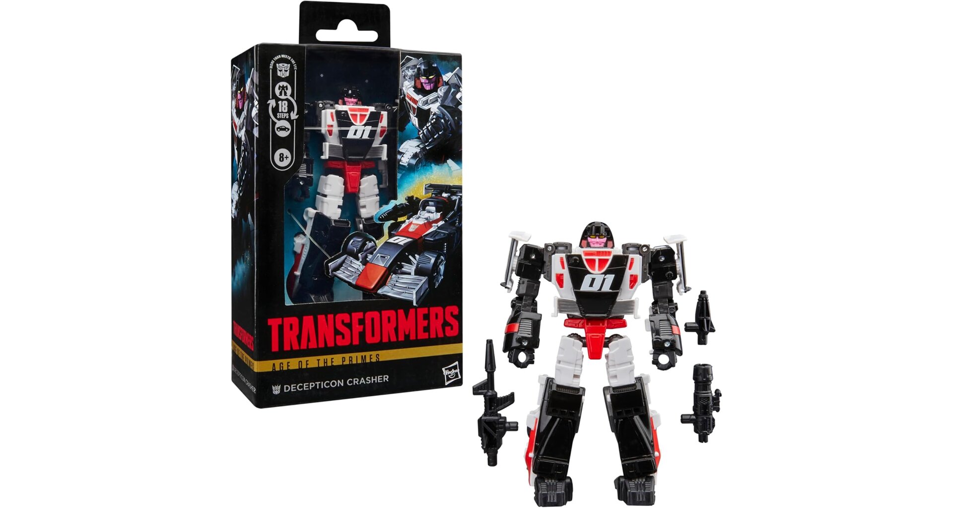Transformer Decepticon Crasher ze série Age of the Primes rozšíří vaši sbírku o ikonického záporáka! Tato 14 cm vysoká akční figurka se přemění z robota na cybertronský sportovní vůz v 18 krocích.