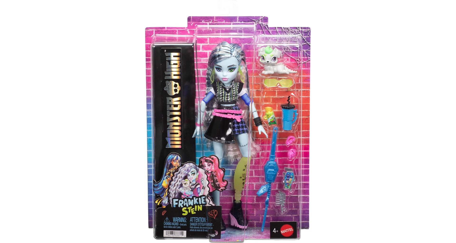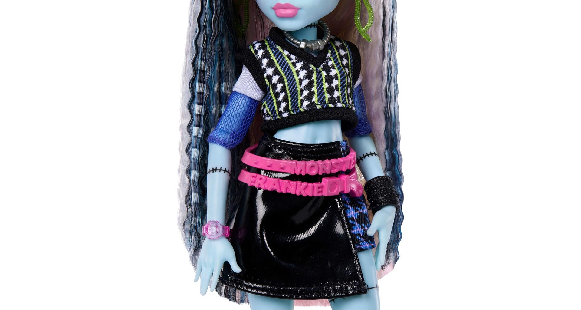 Frankie Stein ze světa Monster High přichází v energickém outfitu inspirovaném jejich ikonickým „high-voltage“ stylem. Zkrácený svetr a černá sukně s efektem kůže doplněné síťovaným rukávem, argyle vzorem a výraznými šperky podtrhují charakteristický vzhled této oblíbené postavy.