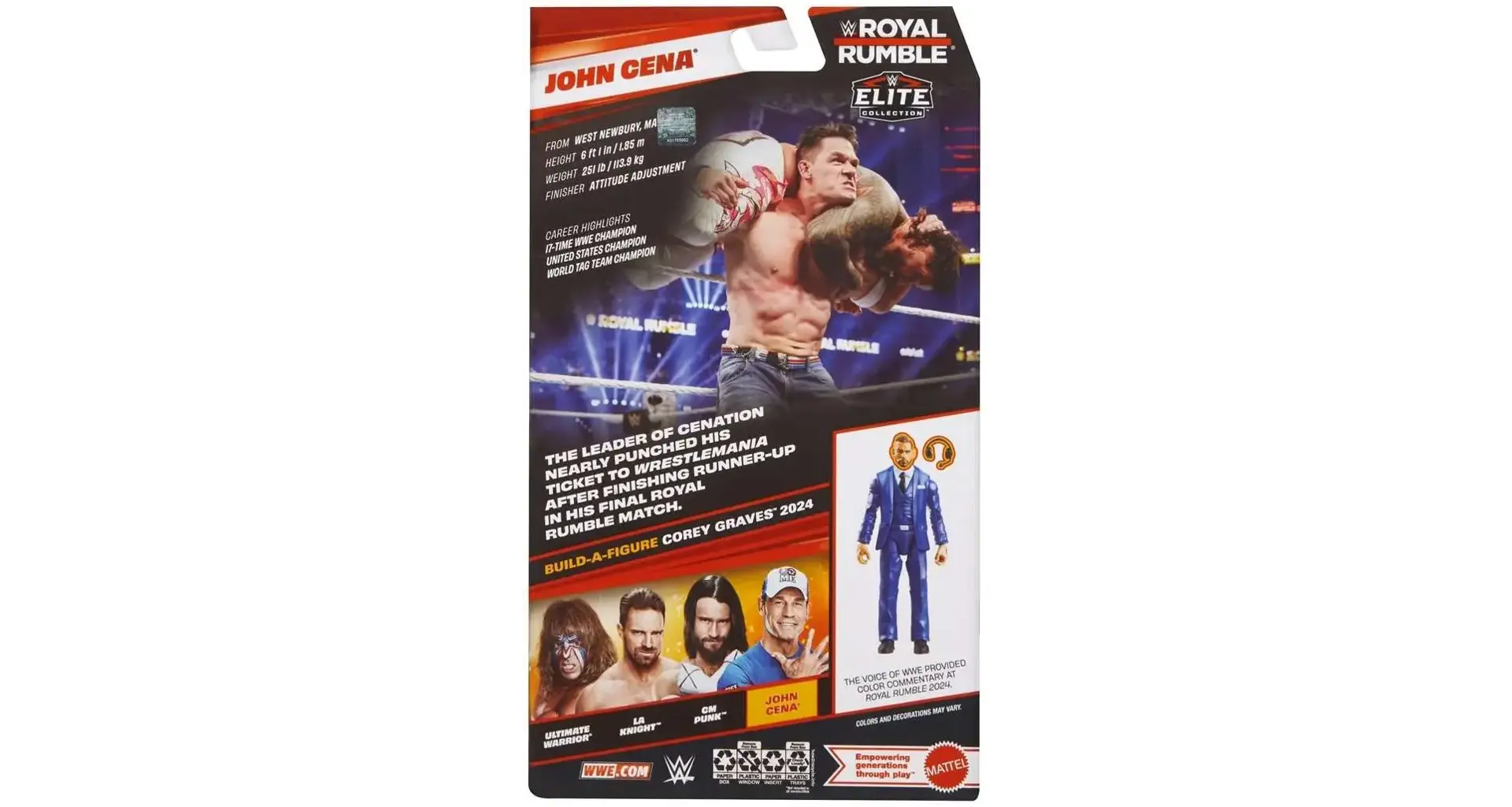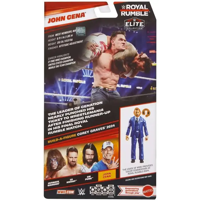 Součástí balení jsou ikonické doplňky Johna Ceny a také díly pro sestavení postavy Corey Graves 2024 v rámci série Build-a-Figure. Skvělý kousek pro fanoušky WWE i sběratele elitní edice.
