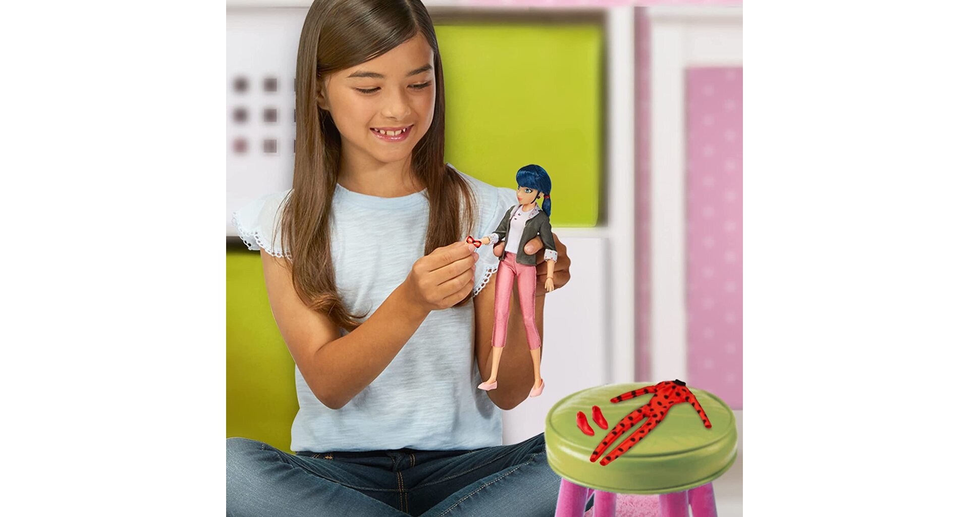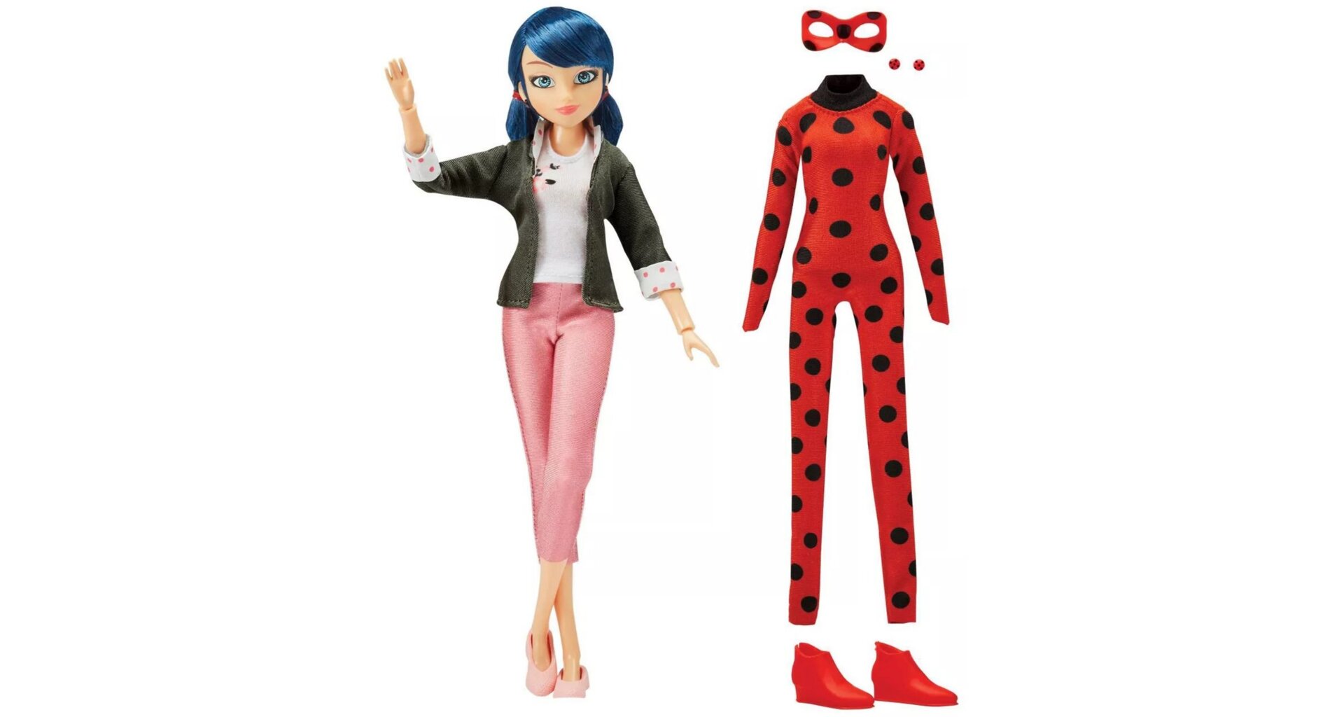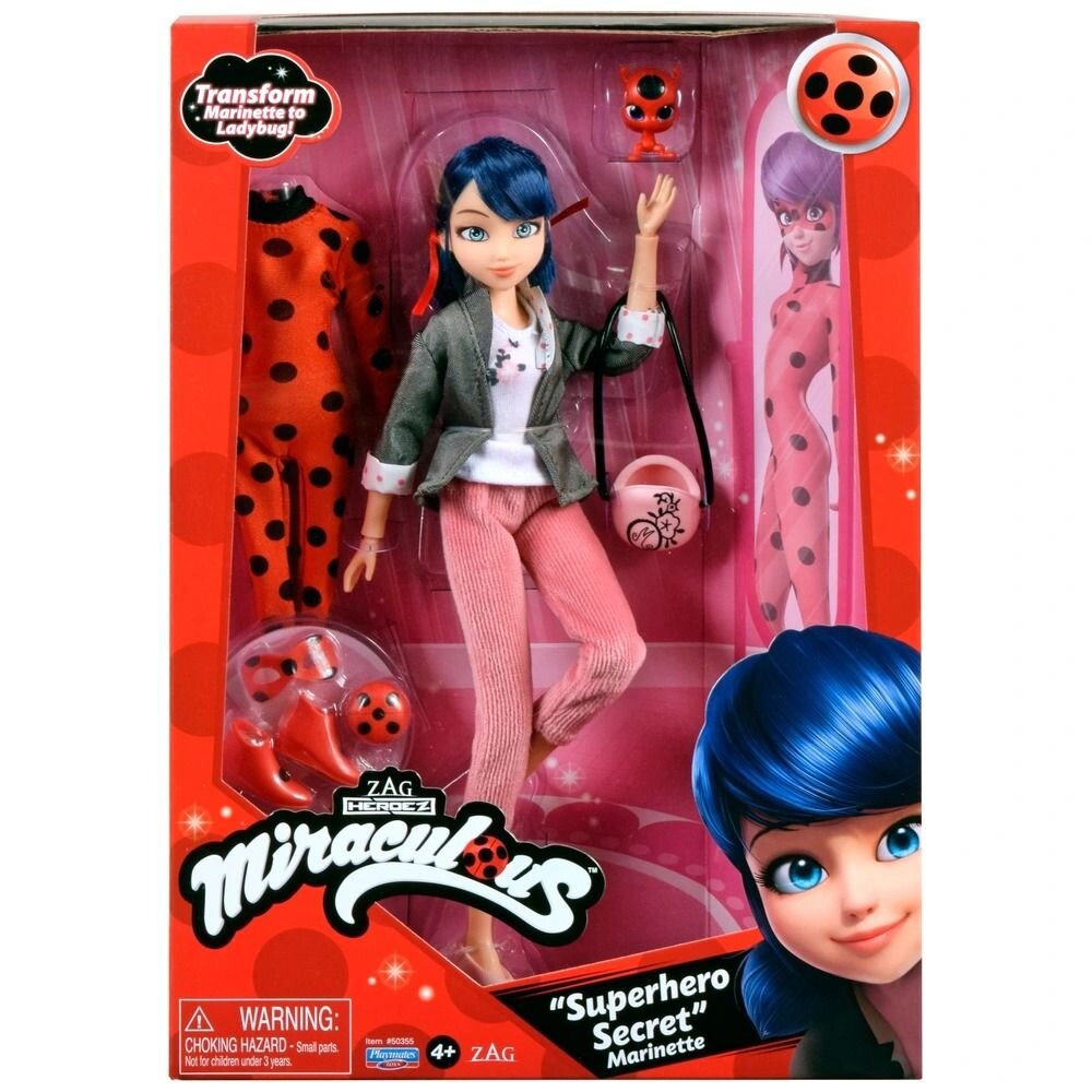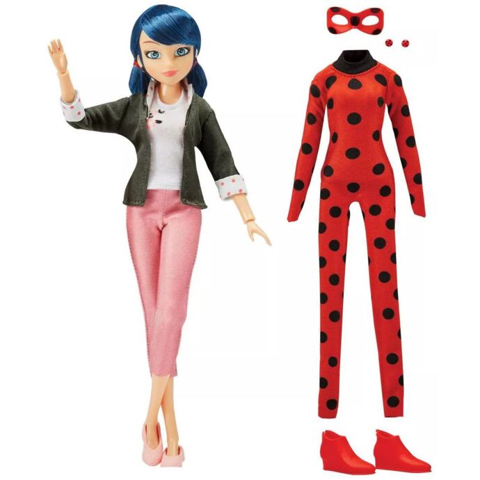 Marinette si své superhrdinské tajemství bedlivě stráží a do své podoby Kouzelné Berušky se mění pouze tehdy, když je její město Paříž v opravdu vážném nebezpečí. V tu chvíli nahradí její slušivý civilní outfit hrdinský kostým, který ji zahalí do jejích typických barev: červené s černými puntíky. Díky masce, červeným botkám a slušivým náušnicím vypadá jako opravdová beruška! Spolu s ní najdete v balení také jejího kwami jménem Tikki.