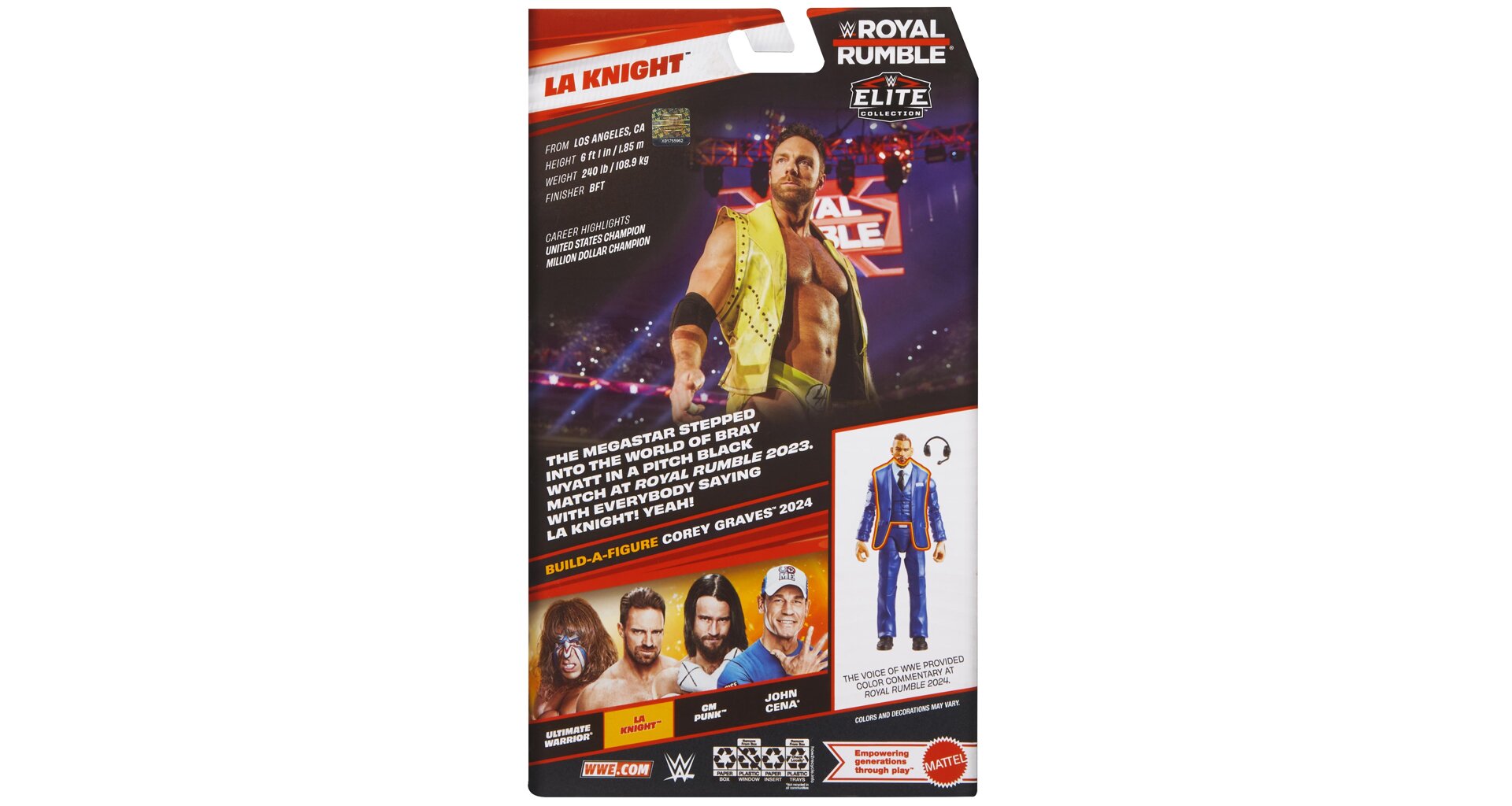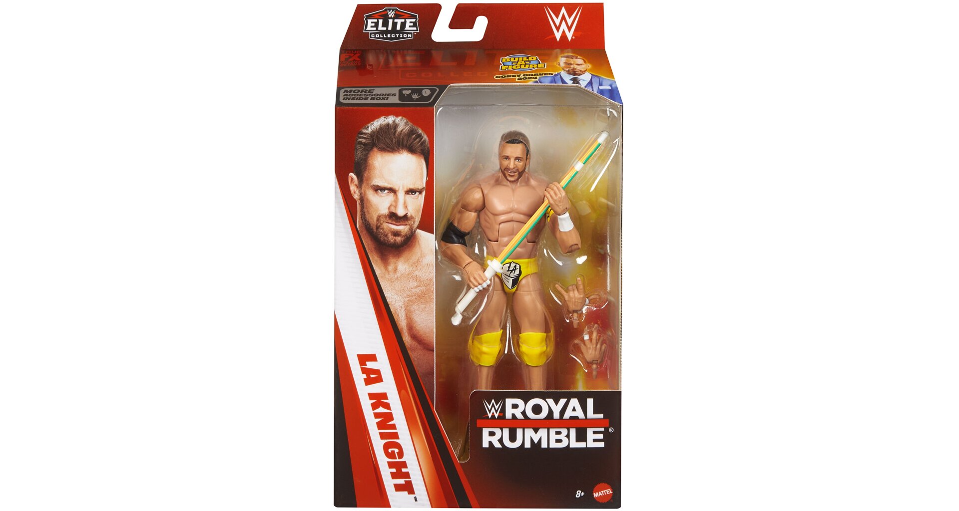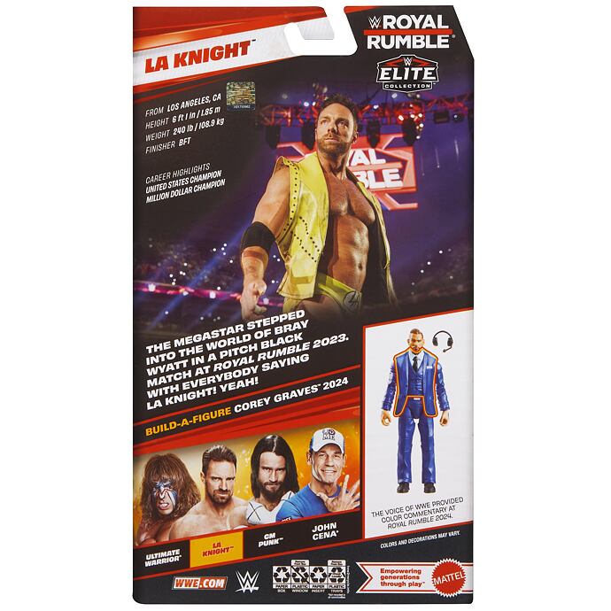 Součástí balení jsou ikonické doplňky LA Knighta, včetně vyměnitelných rukou a zbraně, a také 2 díly Build-a-Figure pro sestavení postavy Corey Graves 2024. Skvělý kousek pro fanoušky WWE i sběratele elitní edice.
