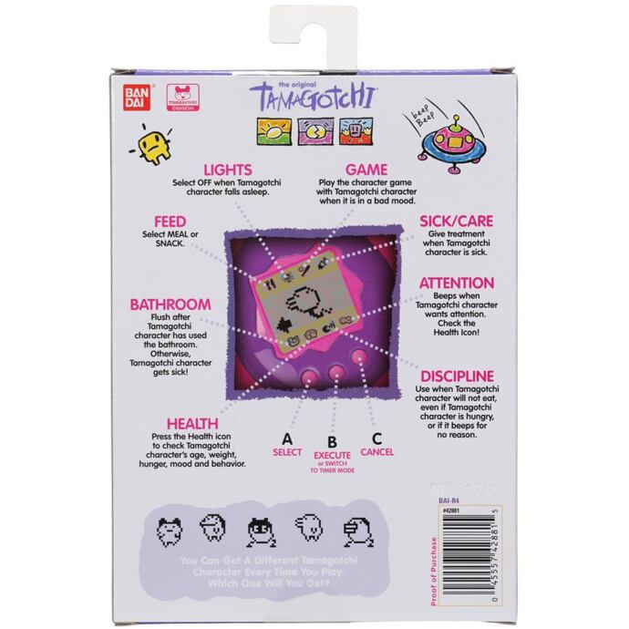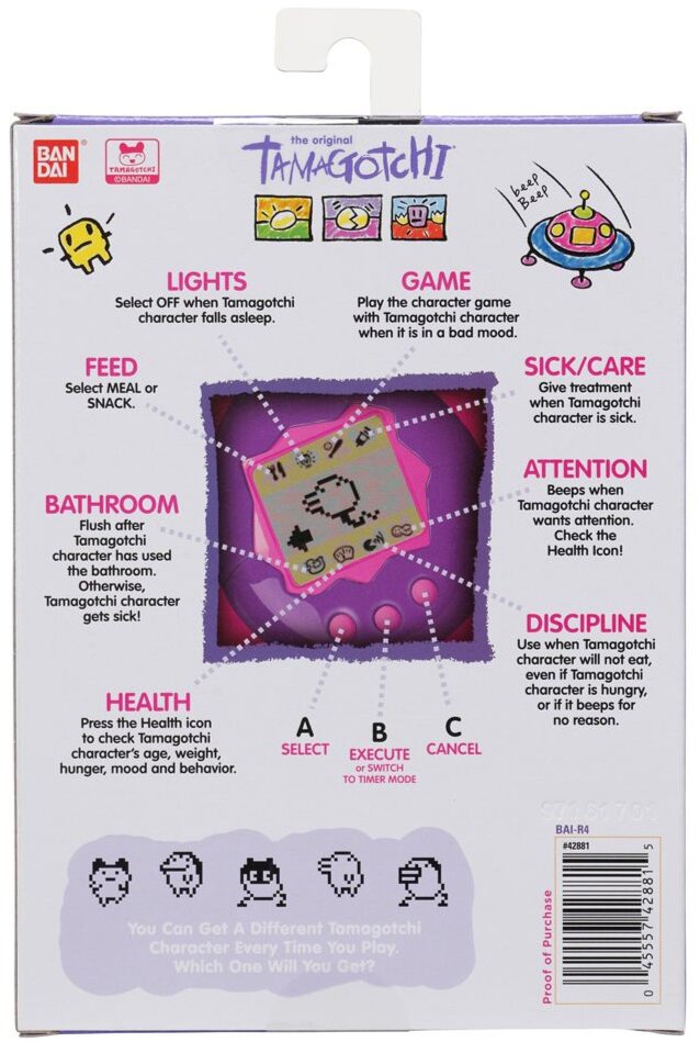 Váš digitální mazlíček vyžaduje vaši péči: je potřeba ho nakrmit, uklidit po něm, spláchnout, když si dojde na záchod, starat se o něj, a dokonce ho čas od času trochu vychovávat, když vás obtěžuje, aniž by cokoliv doopravdy potřeboval. V originálním provedení, které si starší generace mohou pamatovat již z devadesátých let, se snoubí jednoduchost a roztomilost typická pro japonské hračky.
