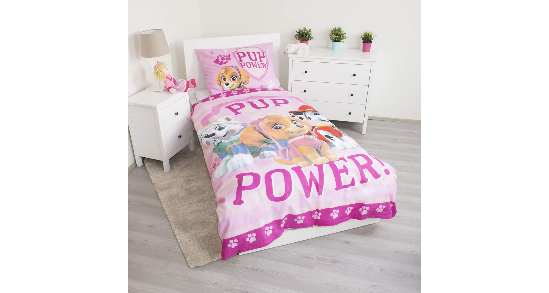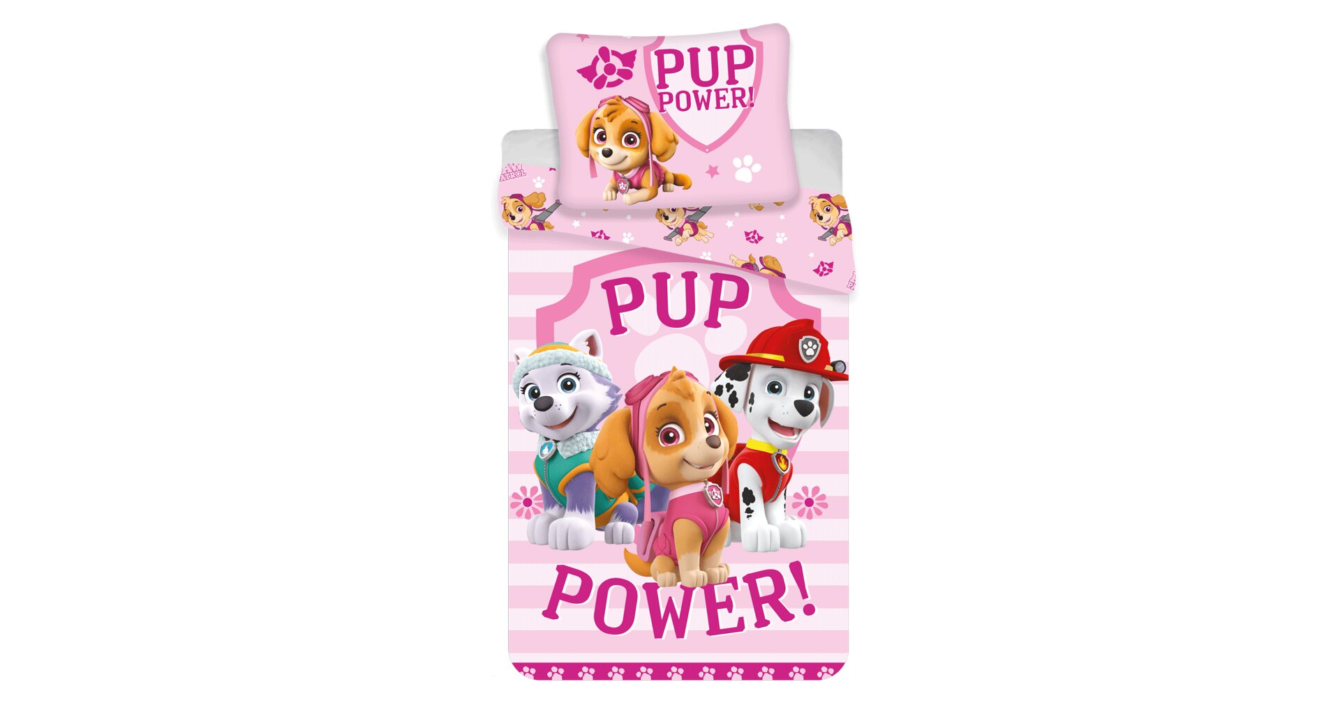 Dětské bavlněné povlečení se štěňátky Skye, Everest a Marshall z Tlapkové patroly. Rozměry povlečení jsou 140 x 200 cm, s povlakem na polštář 70 x 90 cm. Povlečení má z každé strany jiný motiv, má zapínání na zip a je ho možné prát na 40°C.